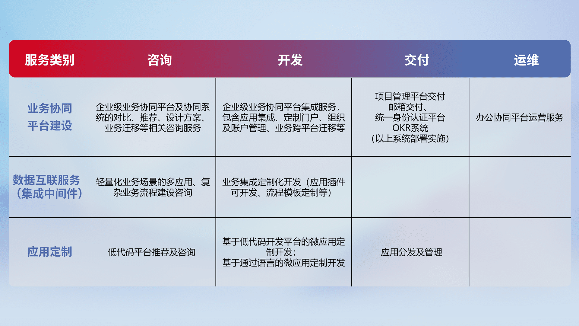 针对钉钉、、企微、、、IDaas等平台级产品提供产品的规划、、方案、、、交付、、、定制化开发等服务,,,实现如统一协同办公、、、、智能客户服务、、混合会议管理、、、、智能数据查询、、、、等业务场景,,,实现数字化转型。。。