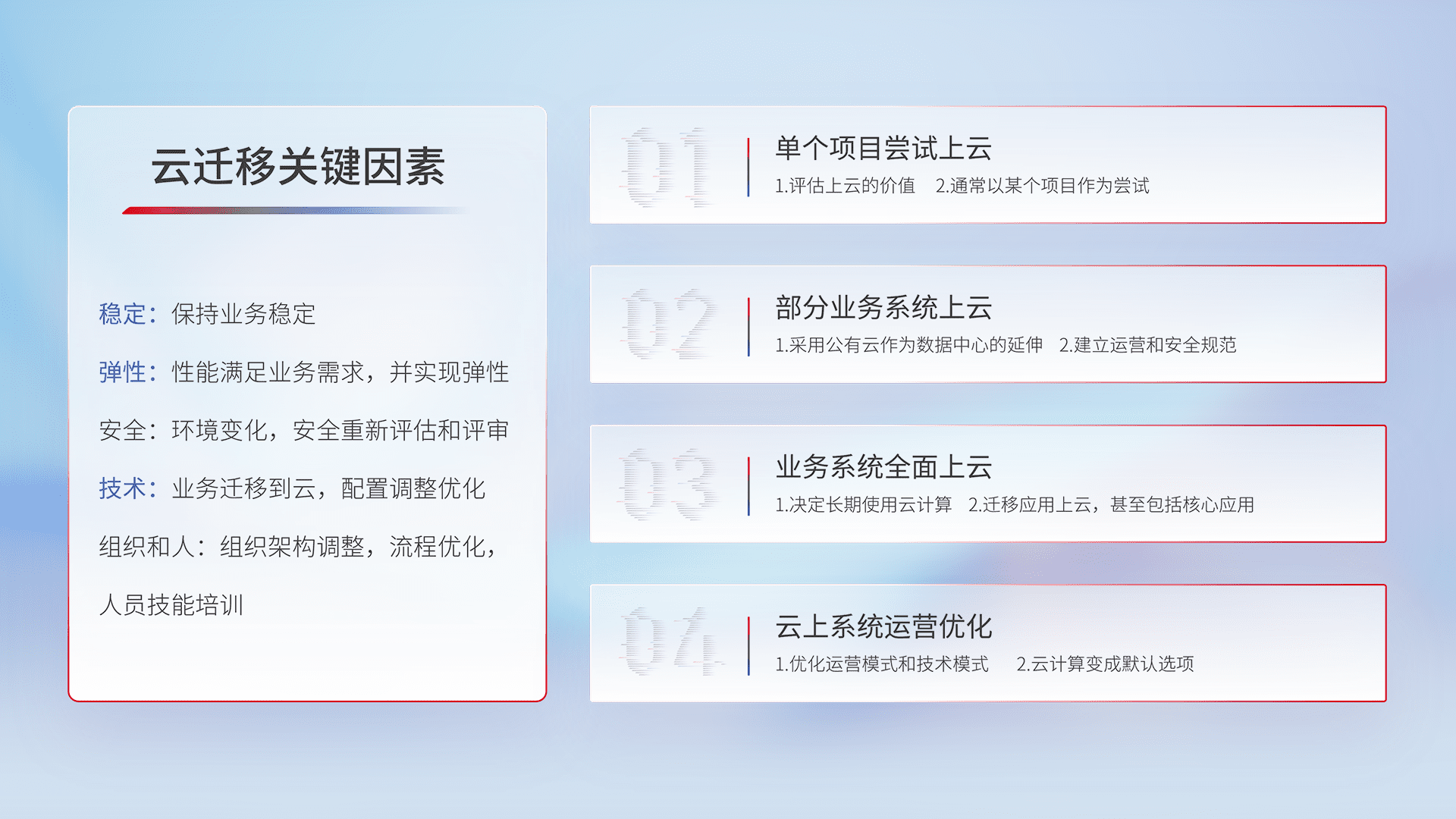 结合实际业务,,从规划设计、、、、云平台选型、、云原生改造、、、、数据迁移、、、、集成交付,,,迁移全过程为客户识别最佳上云路径,,,做好风险识别管理,,,设计网络架构、、身份权限、、、安全审计合规、、、操作审计、、、、日志审计、、、、监控告警策略、、、、多站点容灾设计等,,对云上基础设施进行整体规划,,,,提升IT治理水平,,,以满足弹性、、、、高可用、、、、高性能的需求。。