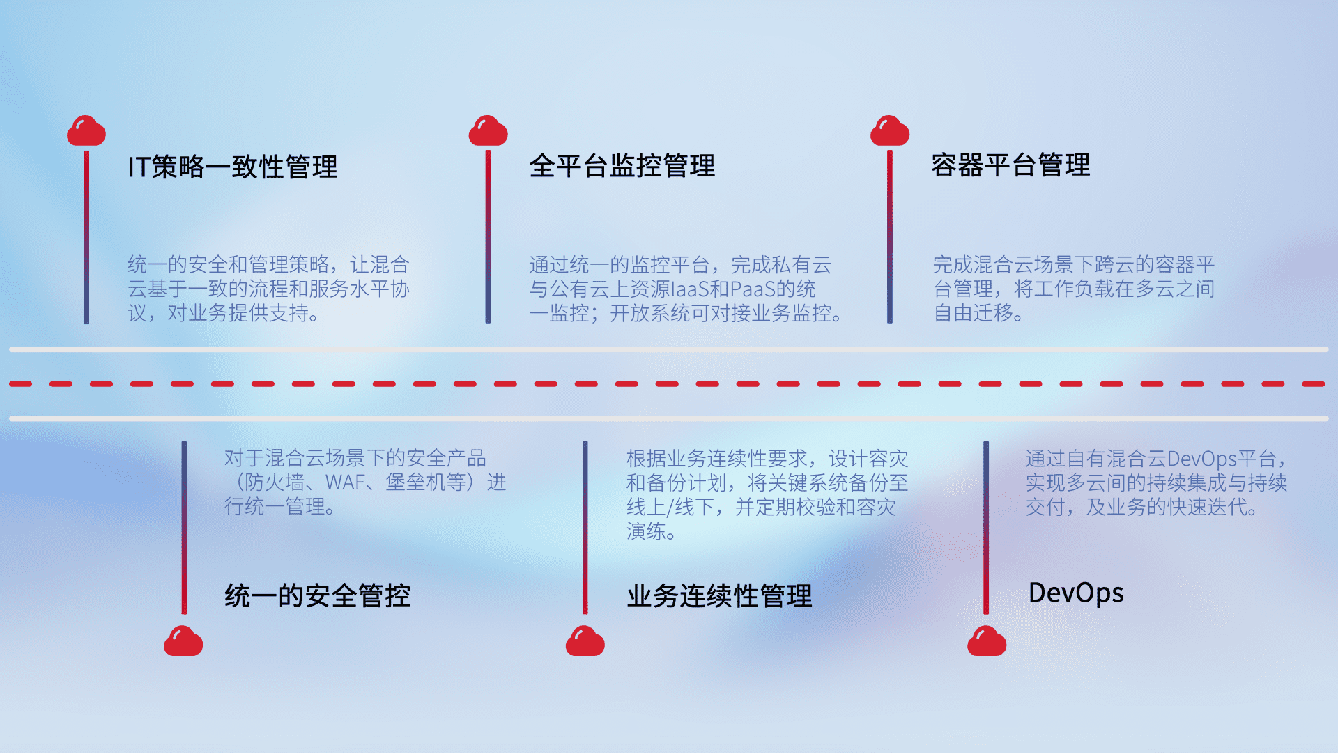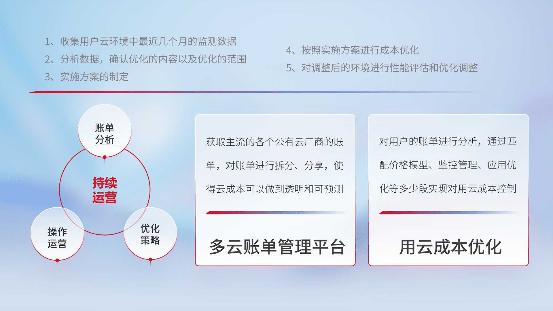 通过多云纳管,,以统一的资源数据模型把客户的云资源进行抽象和封装,,,,进而实现对多云资源的统一操作,,保障云资源管理的可靠性、、、稳定性与可用性。。。。量身定制化运维内容,,,配置、、、开发运维、、补丁管理、、备份、、、监控、、认证和访问管理、、、、审计和日常巡检等,,,,保障在用云过程中的可靠度,,稳定度以及高可用率。。